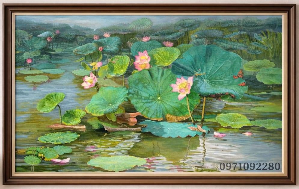 Tranh sơn dầu hồ hoa sen là dòng tranh nghệ thuật mang đậm nét truyền thống Việt Nam, kết hợp giữa vẻ đẹp thiên nhiên và chiều sâu cảm xúc. Với hình ảnh hồ sen yên bình, lá xanh mướt và những bông sen hồng nở rộ, bức tranh không chỉ làm đẹp không gian mà còn mang lại cảm giác thư thái, an yên cho gia chủ.